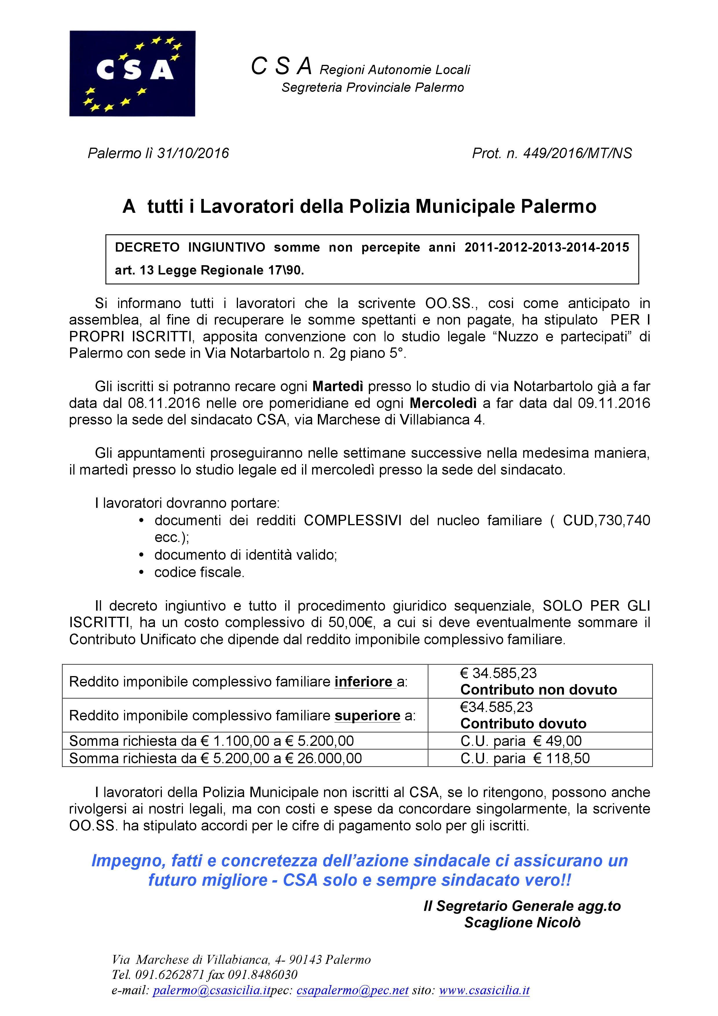 Gli iscritti si potranno recare ogni Martedì presso lo studio di via Notarbartolo già a far data dal 08.11.2016 nelle ore pomeridiane ed ogni Mercoledì a far data dal 09.11.2016 presso la sede del sindacato CSA, via Marchese di Villabianca 4.