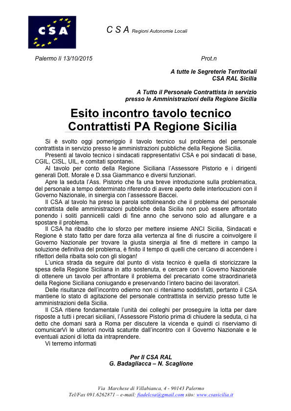 Delle risultanze dell’incontro odierno non ci riteniamo soddisfatti, pertanto il CSA mantiene lo stato di agitazione del personale contrattista in servizio presso tutte le amministrazioni della Sicilia.