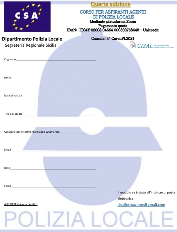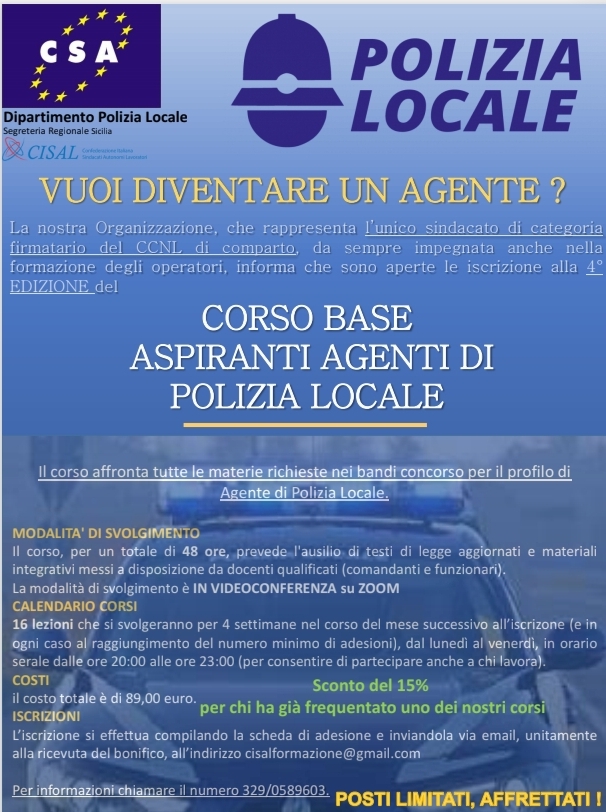 CISAL FORMAZIONE Navigazione articoli 3° CORSO DI PREPARAZIONE AI CONCORSI PER IMPIEGATO COMUNALE (locandina + modulo adesione) CSA, Assemblea personale della Polizia Municipale giovedì 11 Novembre 2021