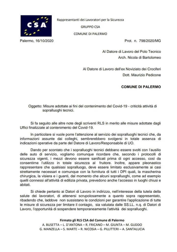 Comune di Palermo Navigazione articoli CSA, Covid 19: criticità igienizzazione e sanificazione mezzi di servizio CSA, Richiesta urgente incontro stabilizzazione precari Ente