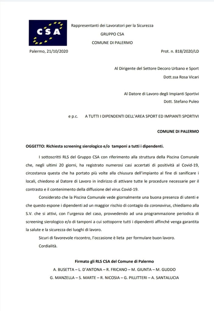 Comune di Palermo Navigazione articoli FPCGIL-CSARAL-UILFPL, volantino resoconto incontro sulla gestione emergenza Covid-19 al Comune di Palermo RLS Gruppo CSA, Richiesta screening sierologico e o tamponi a tutti i dipendenti delle Circoscrizioni e Postazioni Decentrate
