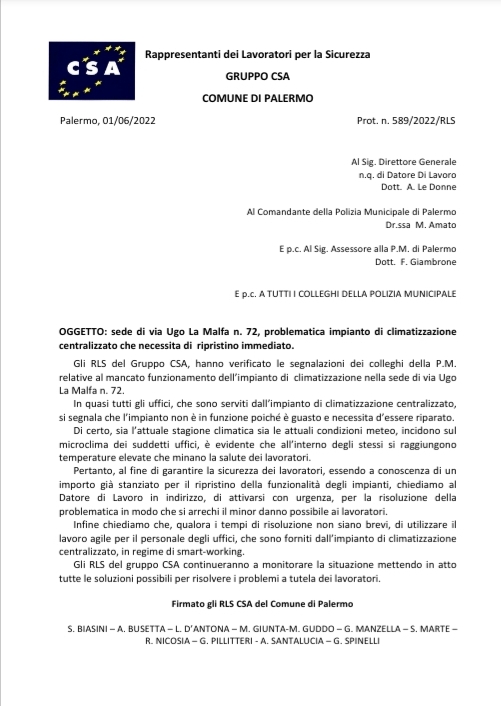 Navigazione articoli RLS gruppo CSA, Locali Polo Tecnico via Ausonia 69, Mancata climatizzazione Uffici – richiesta urgente ripristino funzionalità impianti SEGR. NAZ. CSA, RESOCONTO DELLA RIUNIONE PER IL RINNOVO DEL CCNL FUNZIONI LOCALI DELL’8 GIUGNO
