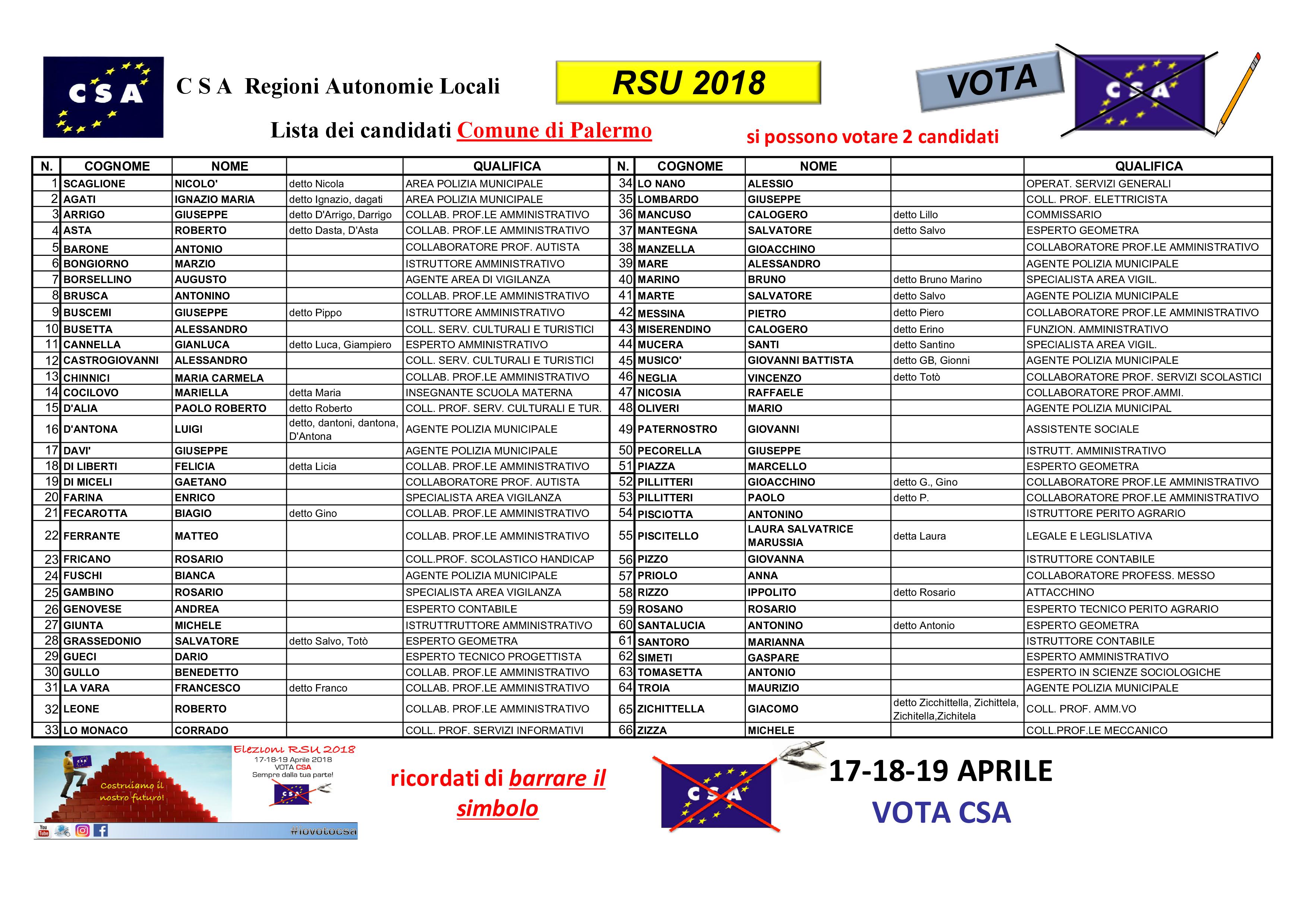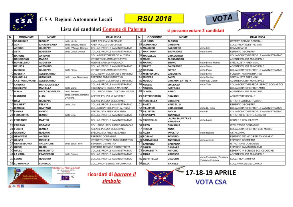 RSU 2018 COMUNE DI PALERMO LISTA DEI CANDIDATI CSA Vota CSA perché il futuro lo vogliamo scrivere e non leggere!! #csa #iovotocsa #rsu2018 #comunepalermo Navigazione articoli CSA-UILFPL, Riscontro nota prot. AREG/2018/565416-STSC del 23/03/18, recante “ Modifica orario di servizio della U.O. Nucleo Esecuzione T.S.O.”. RSU Comune di Partinico Liste per il rinnovo delle RSU 2018