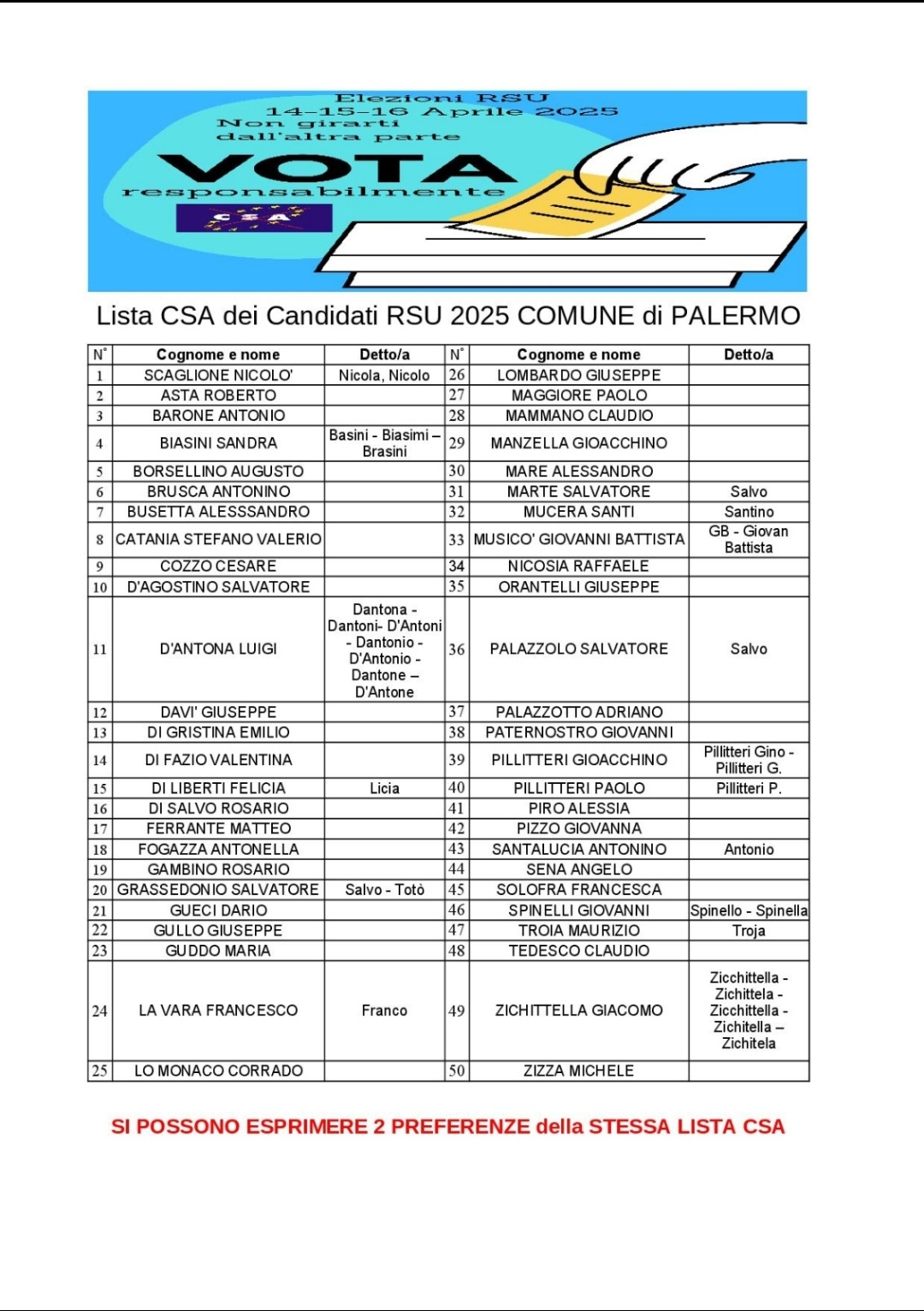 VOTA CSA, per farlo ti basta: Barrare soltanto il simbolo del CSA e si possono esprimere fino a 2 preferenze (si allega👇🏻 lista candidati CSA). Grazie!!