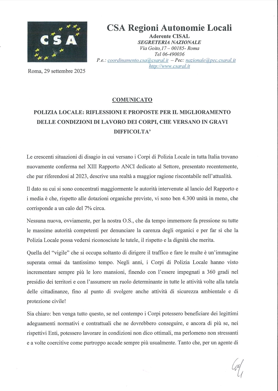 Navigazione articoli CSA CISAL: Comunicato Sindacale “Approvato il regolamento incentivi tecnici!” CSA CISAL, Richiesta impinguamento fondo risorse decentrate anno 2025.