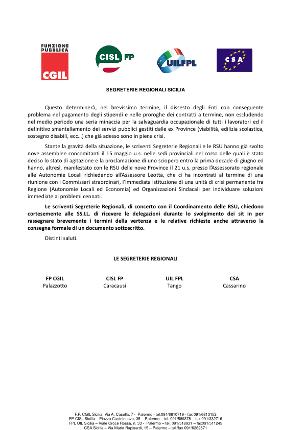 Oggetto: Stato di agitazione dei lavoratori delle ex Province Regionali. Sit in presso le
